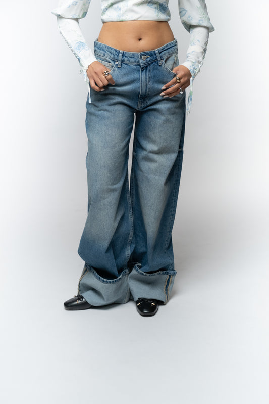 Wide-Legged Denim Jeans with Color-Blocked Hem
