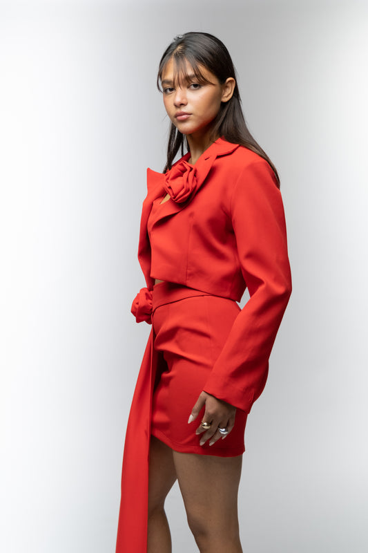 Red Blazer & Skirt Set with Floral Details