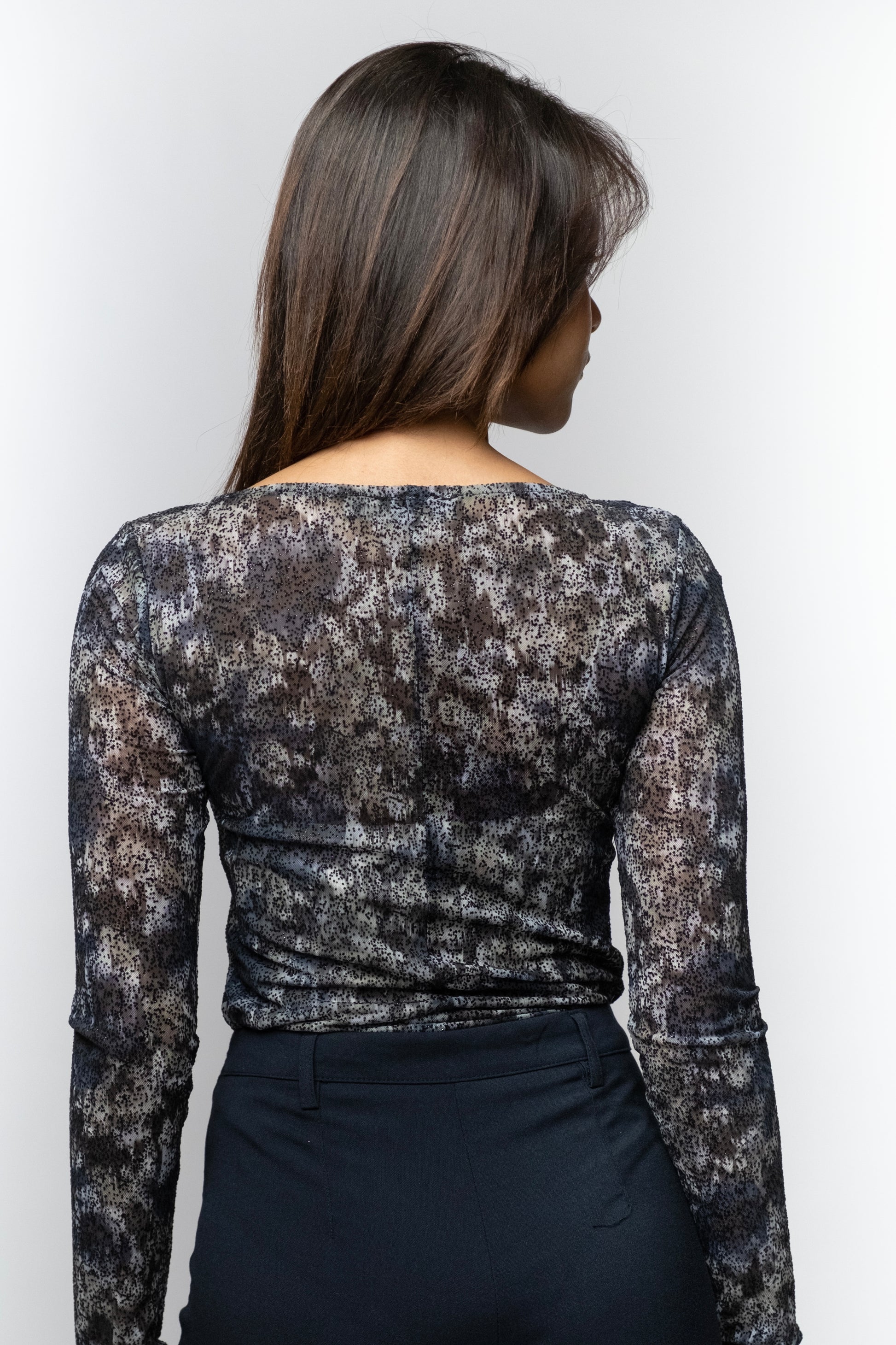 This stylish long-sleeve top features a striking abstract print in shades of gray, black, and white, creating a modern and artistic look. Its soft and stretchy fabric ensures comfort throughout the day, while the fitted design enhances your silhouette. The versatile print makes it a great match for both casual and semi-formal outfits.