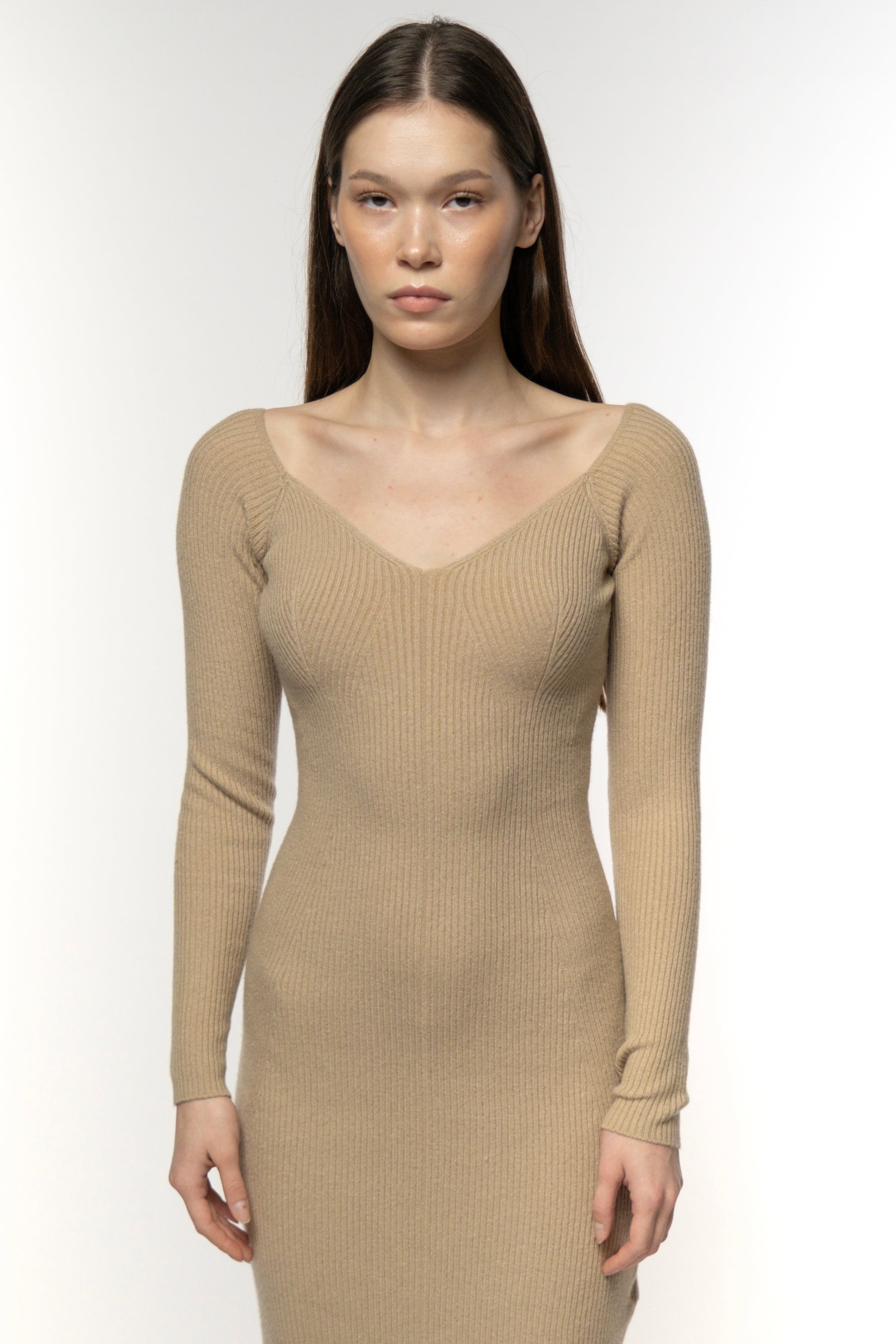 A figure-flattering ribbed knit dress in a soft sand beige shade, featuring a deep V-neck and long sleeves. The dress offers a comfortable fit that molds to your body, while the mid-length hemline adds an elegant touch. This versatile piece is perfect for dressing up with heels or down with sneakers, making it an essential addition to your wardrobe for year-round wear.