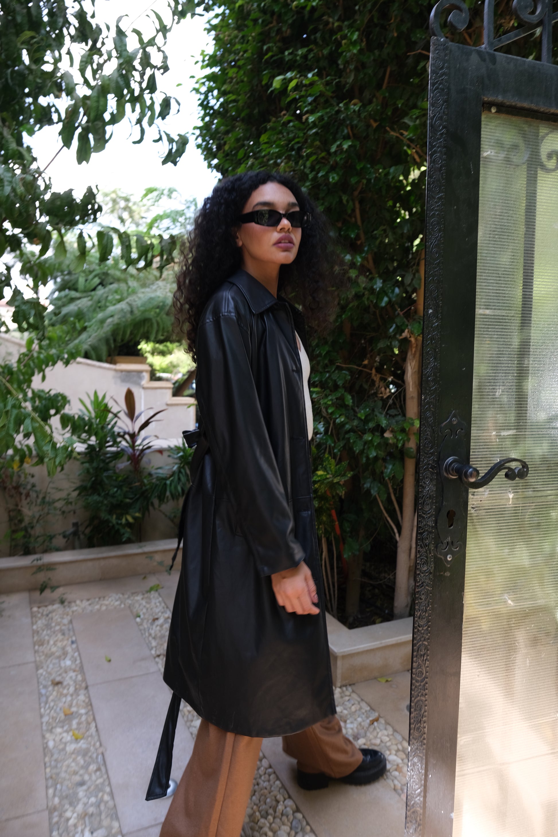 Elevate your outerwear with the Nova Faux Leather Trench Coat. Crafted from sleek faux leather, this long coat features a classic trench design with a modern twist, including a tie waist for a flattering, adjustable fit. The buttoned closure, high collar, and chic side slits add to its timeless yet edgy appeal. Perfect for layering over both casual and dressy outfits, the Nova coat adds a bold, sophisticated touch to your wardrobe, making it an essential for any season.