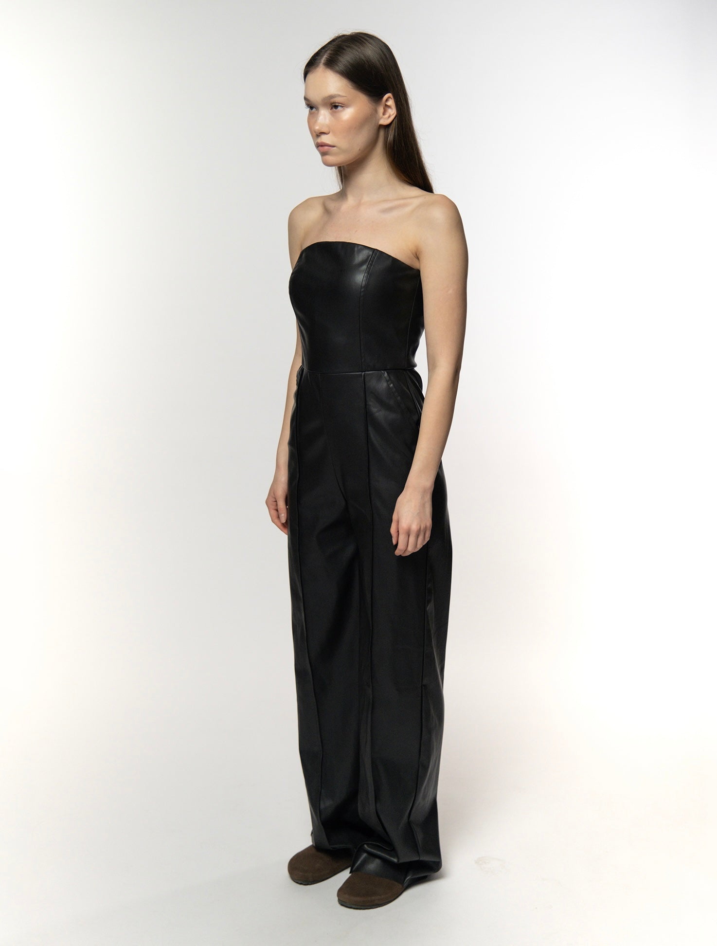 This black leather strapless jumpsuit is the epitome of bold, stylish sophistication. With its structured bodice and wide-leg design, it offers a striking, fashion-forward silhouette. Crafted from high-quality leather, it provides a sleek and edgy look while ensuring comfort and durability. Perfect for evening events or upscale occasions, this piece guarantees you'll stand out with confidence and style.