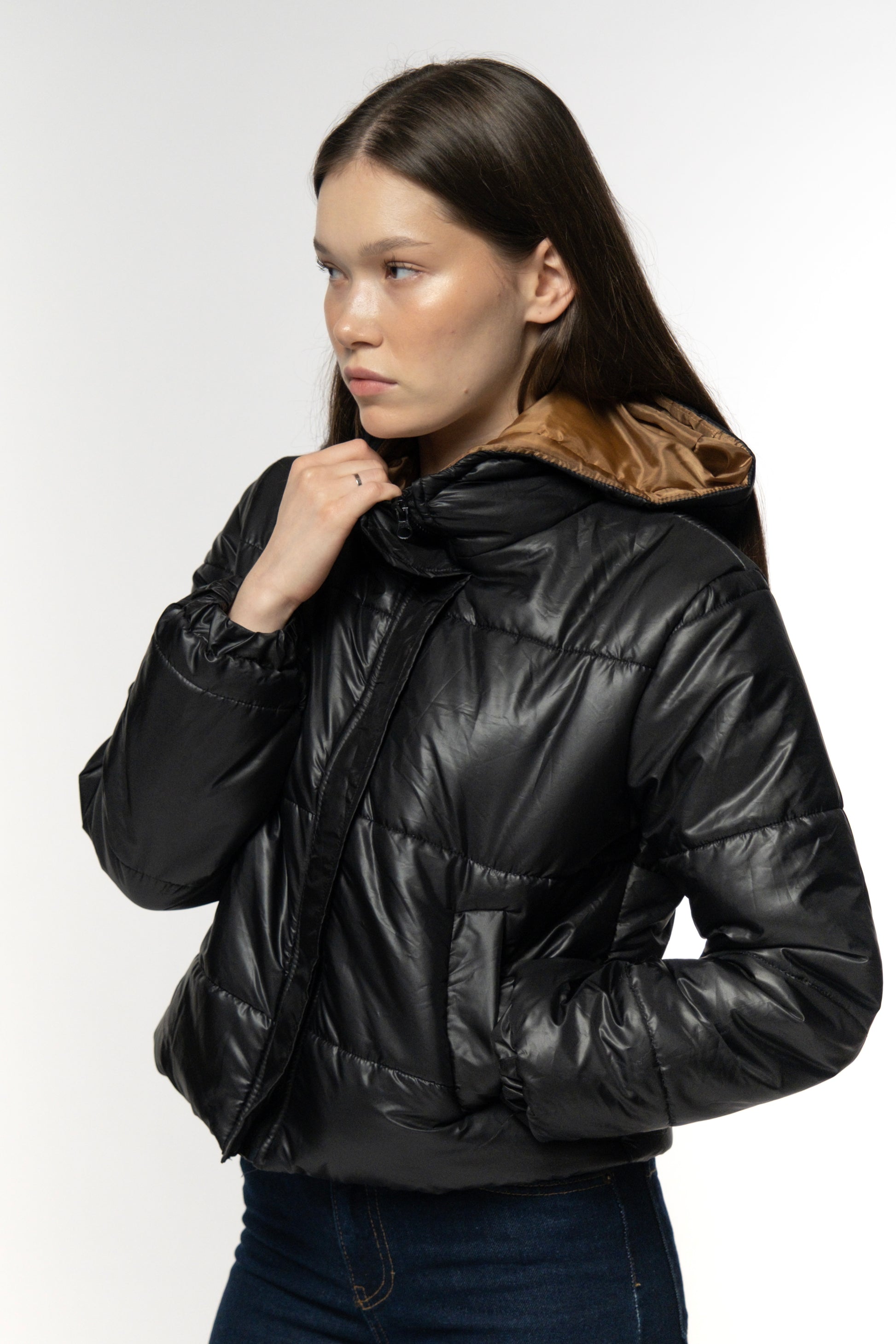 Brave the cold in style with the Onyx Quilted Puffer Jacket. Made from a water-resistant, high-shine fabric, this jacket provides warmth and comfort with its insulating down-like fill. Featuring a soft camel lining for a contrasting touch of warmth, the oversized fit and sleek black tone give it a bold, contemporary look. The zip-up closure and high collar offer extra protection against the chill, making it perfect for layering over chunky knits or fitted dresses for a versatile winter outfit.