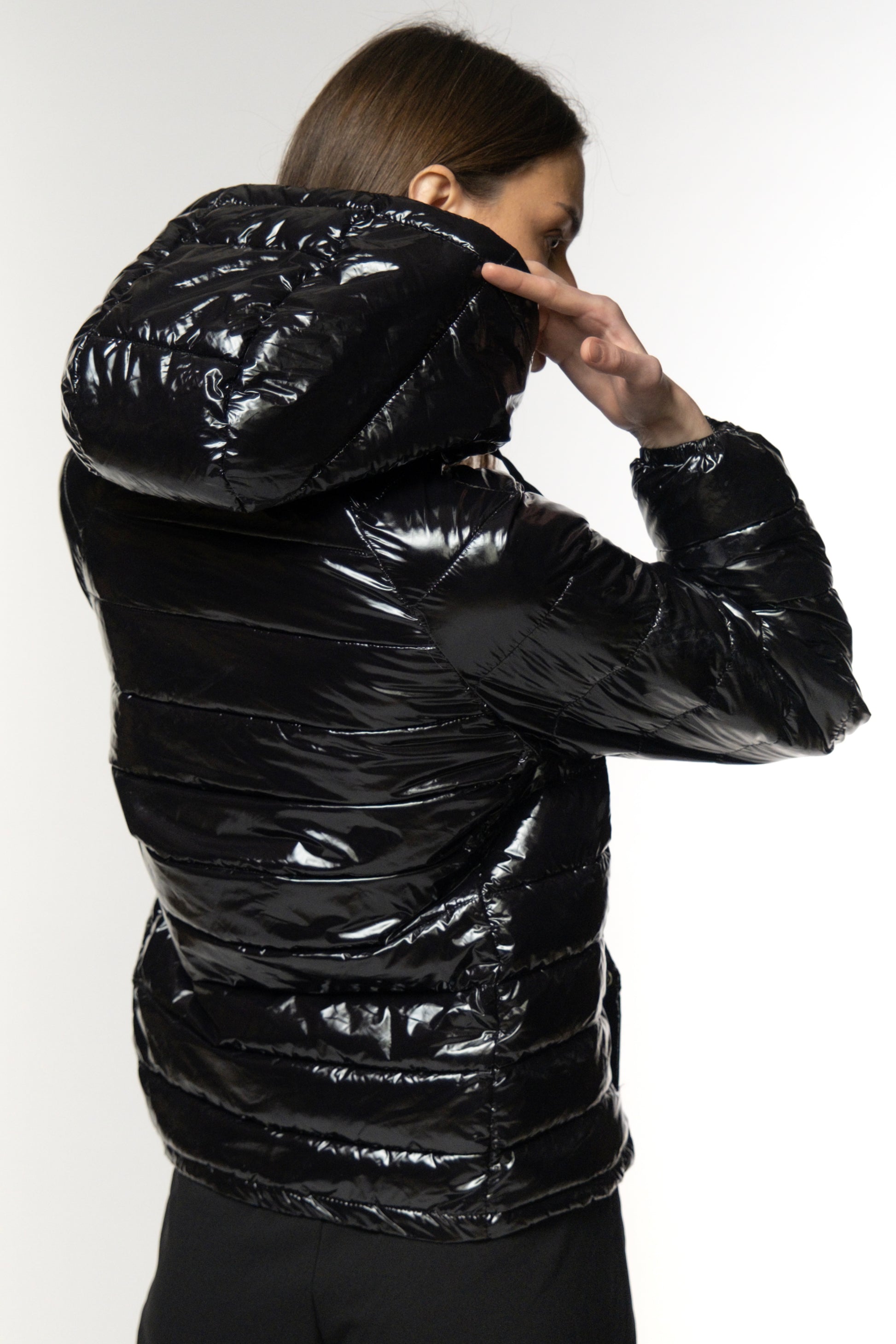 A sleek and stylish black puffer jacket with a glossy finish, perfect for adding a chic touch to your winter wardrobe. Featuring a functional zip closure and adjustable drawstrings on the hood, it offers both style and practicality. The lightweight yet warm design makes it an ideal outerwear choice for cooler days. Wear it over any casual outfit to stay cozy and fashionable all season long.
