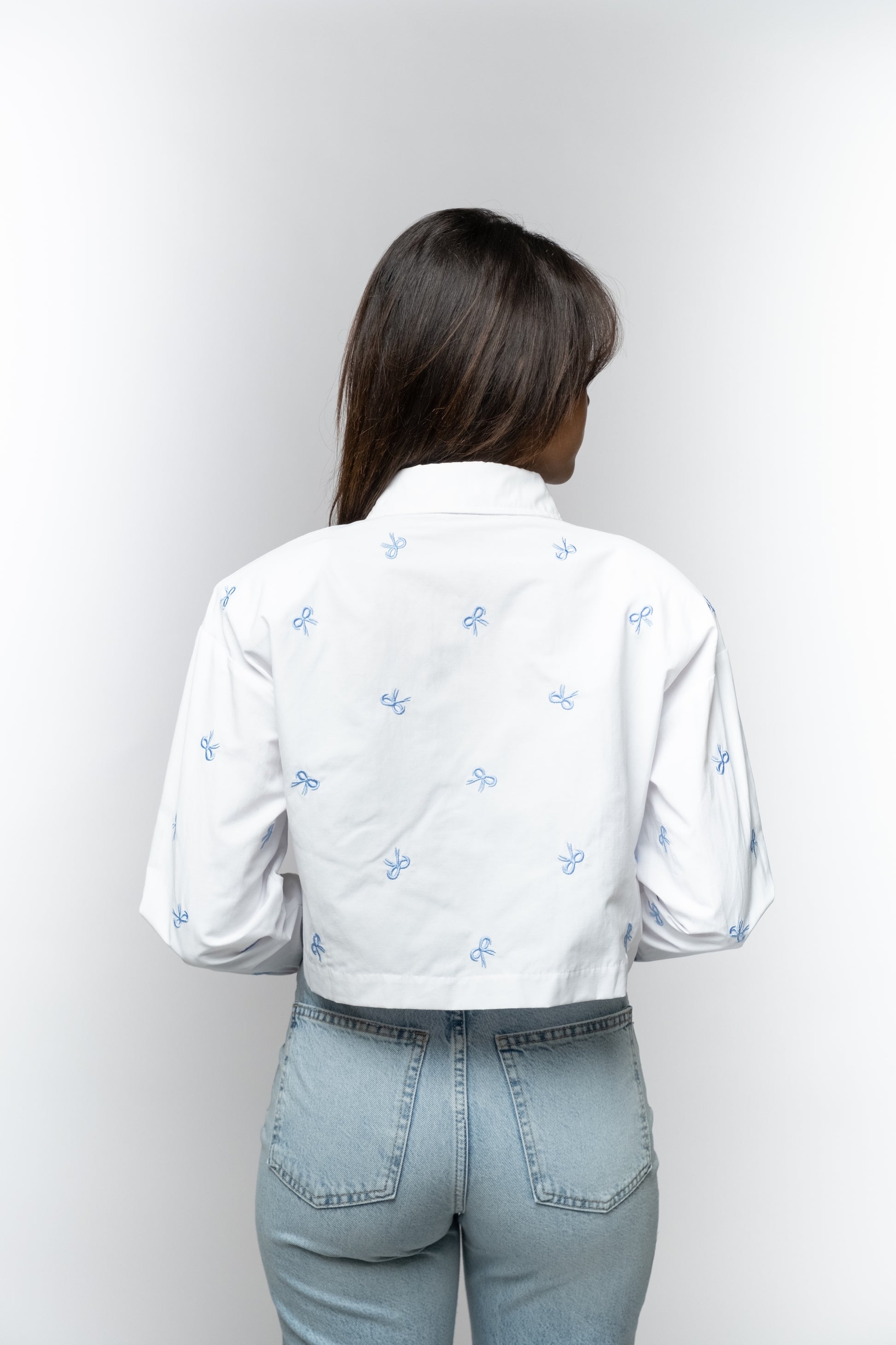 This crisp white button-up shirt features delicate blue bow embroidery scattered across the fabric, adding a playful and charming touch to the classic design. With a front pocket and a collar, it combines elegance with a hint of whimsy. The shirt’s breathable fabric ensures comfort while offering a versatile look suitable for casual and semi-formal occasions.