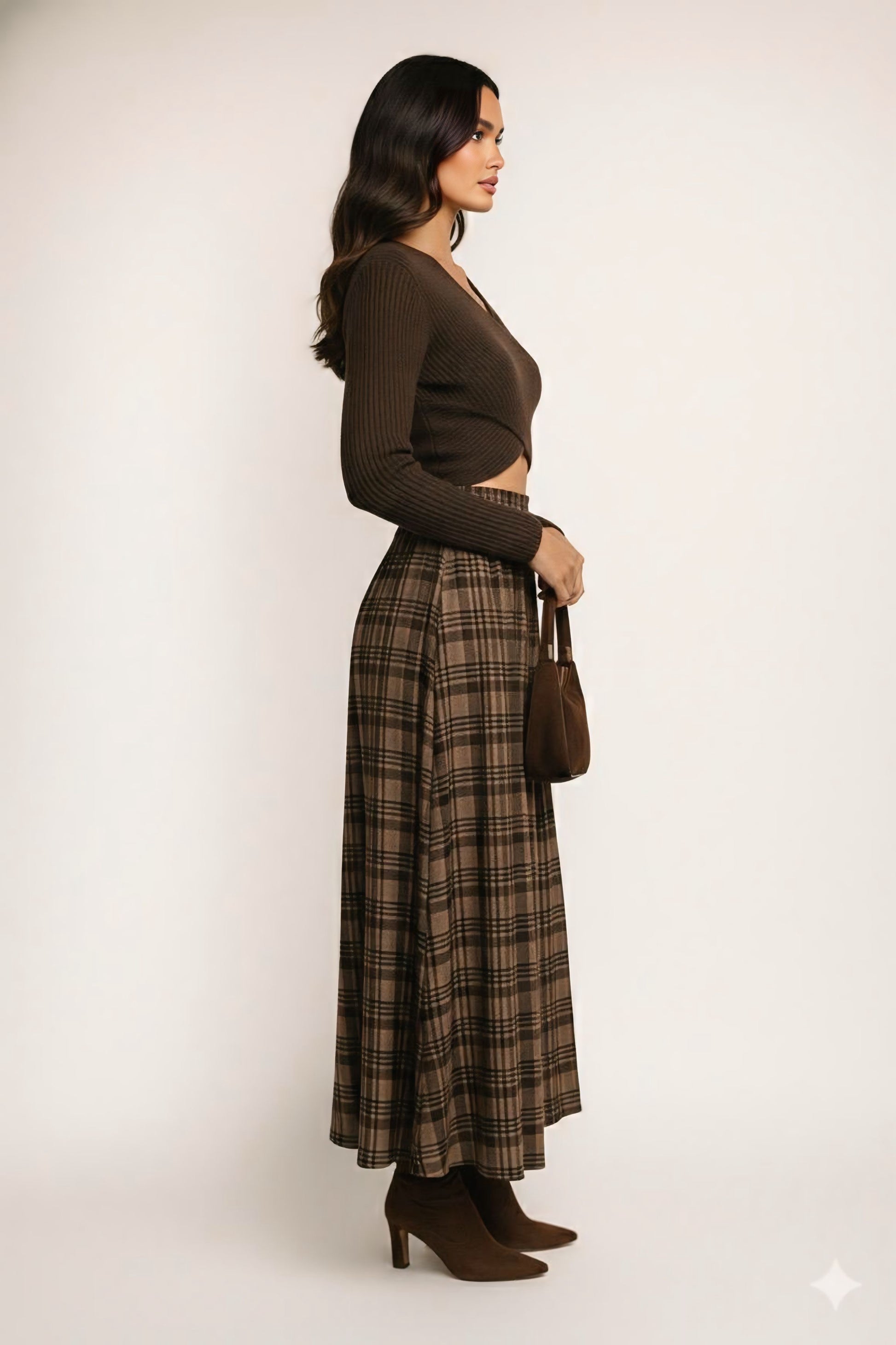 A lightweight brown checkered pleated skirt with an elastic waistband and a flowy silhouette.