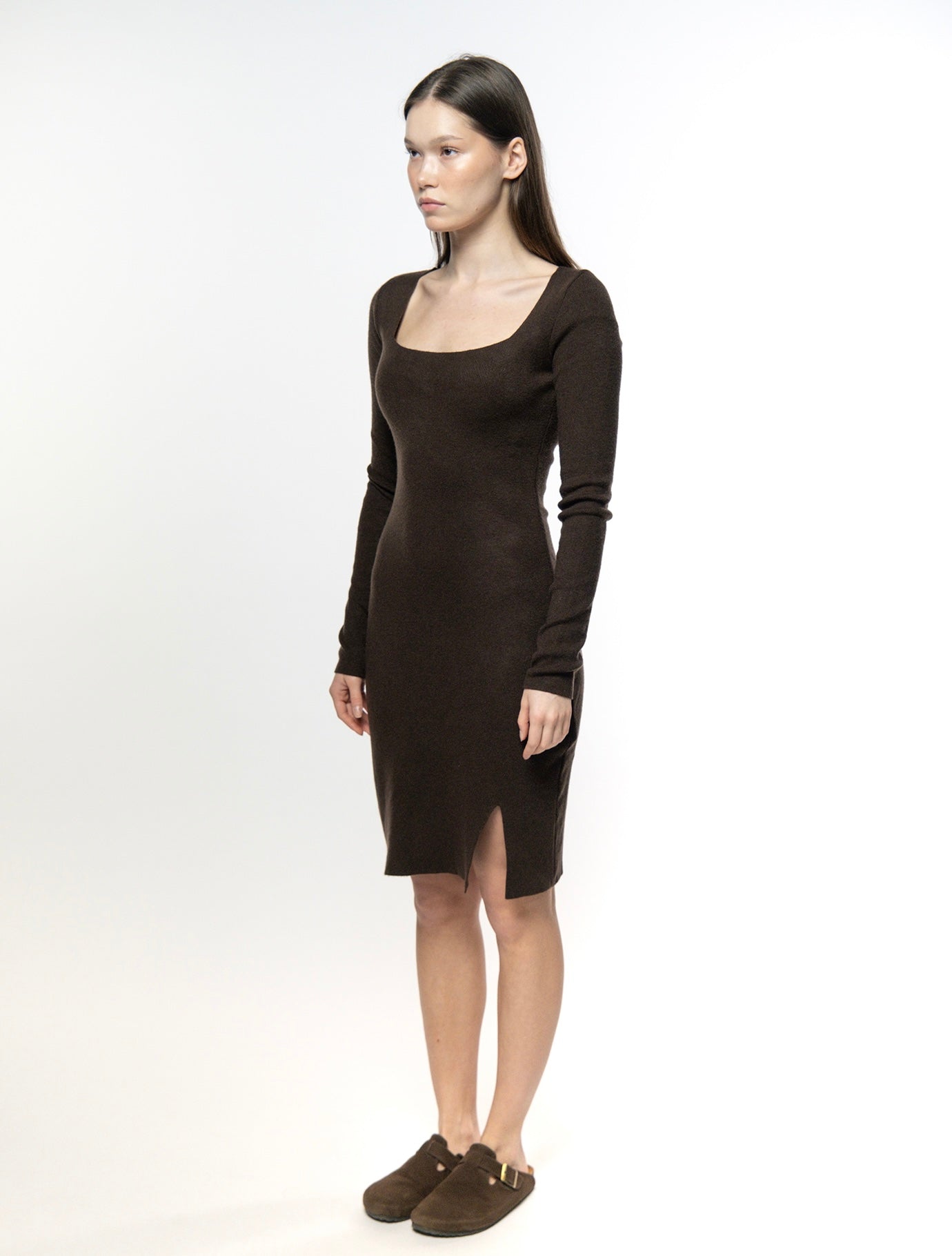 This figure-hugging dress in a rich chocolate brown features a flattering square neckline and long sleeves, offering a modern yet timeless silhouette. The side slit adds a touch of allure, making this piece perfect for both casual outings and elegant events. The ribbed texture ensures comfort and warmth, while the color makes it a versatile wardrobe staple.