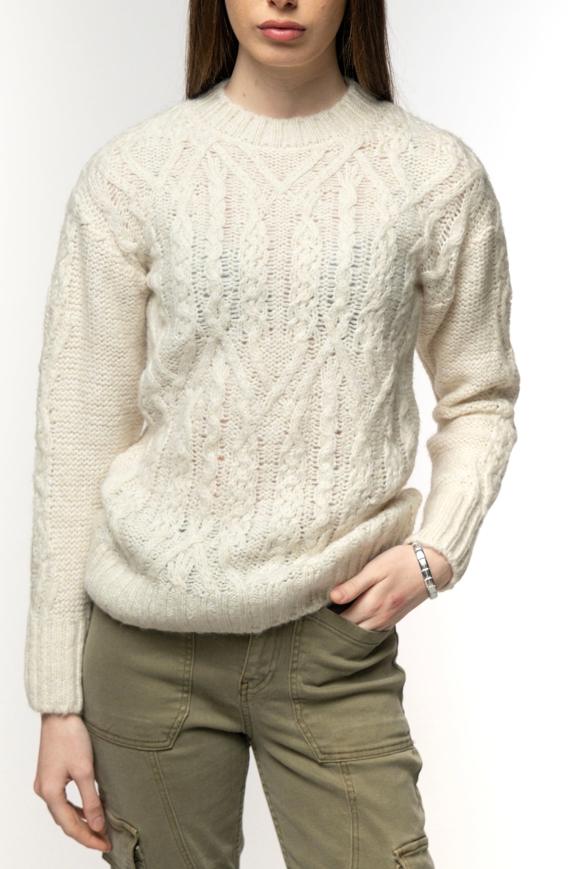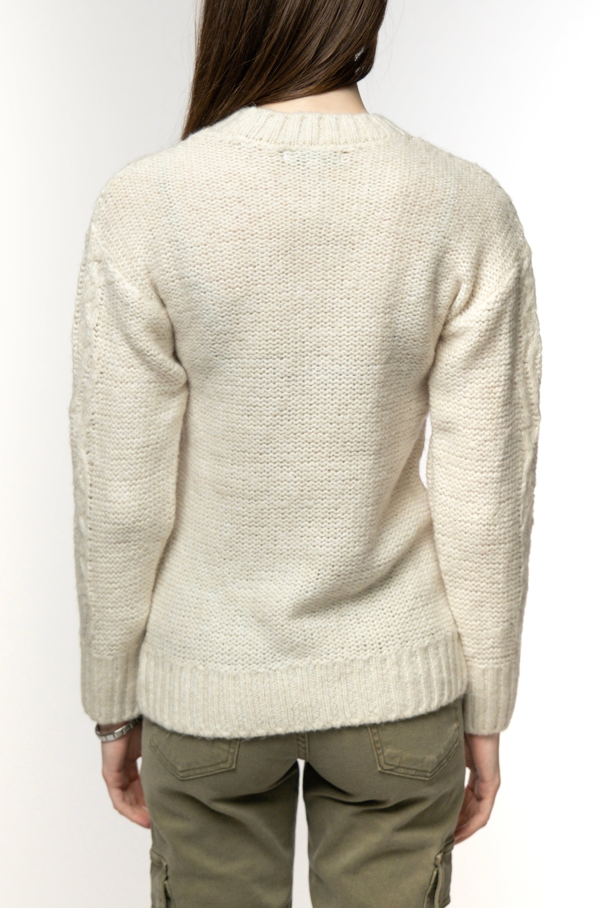 This cream cable knit sweater is a classic winter staple, designed to bring warmth and texture to your wardrobe. Featuring a timeless cable knit pattern, it offers both style and comfort. Its soft fabric and relaxed fit make it ideal for layering over shirts or wearing on its own. The round neckline and ribbed cuffs give it a clean, structured finish, while the cozy feel makes it perfect for colder days. Pair it with jeans or cargo pants for a relaxed, casual look or dress it up with skirts for a more polished ensemble.
