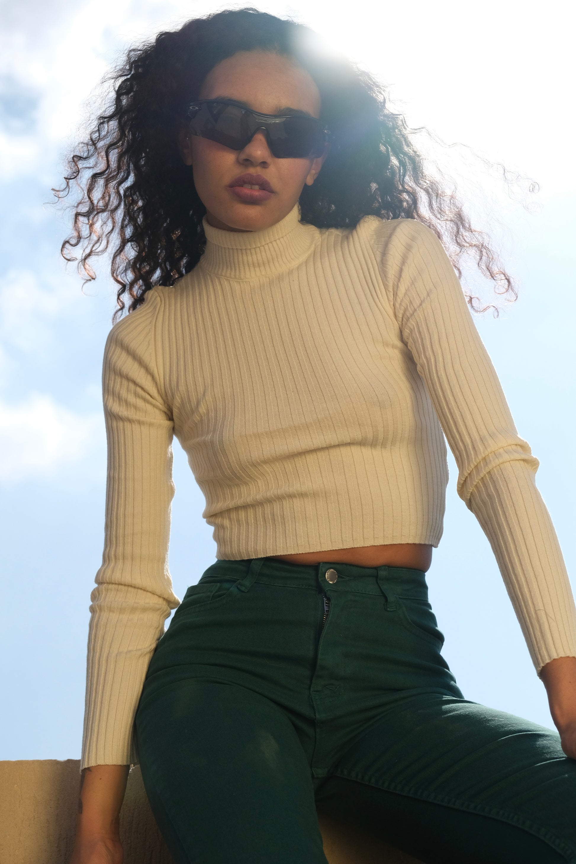 A versatile cream ribbed turtleneck pullover designed to add warmth and style to your wardrobe. Crafted from a soft, stretchy fabric, this fitted piece hugs the body while allowing for easy movement. The classic turtleneck design provides extra warmth around the neck, making it perfect for layering under jackets or wearing on its own. Pair it with high-waisted pants for a casual, chic look or tuck it into skirts for a more polished outfit. Ideal for both everyday wear and dressing up for an evening out.