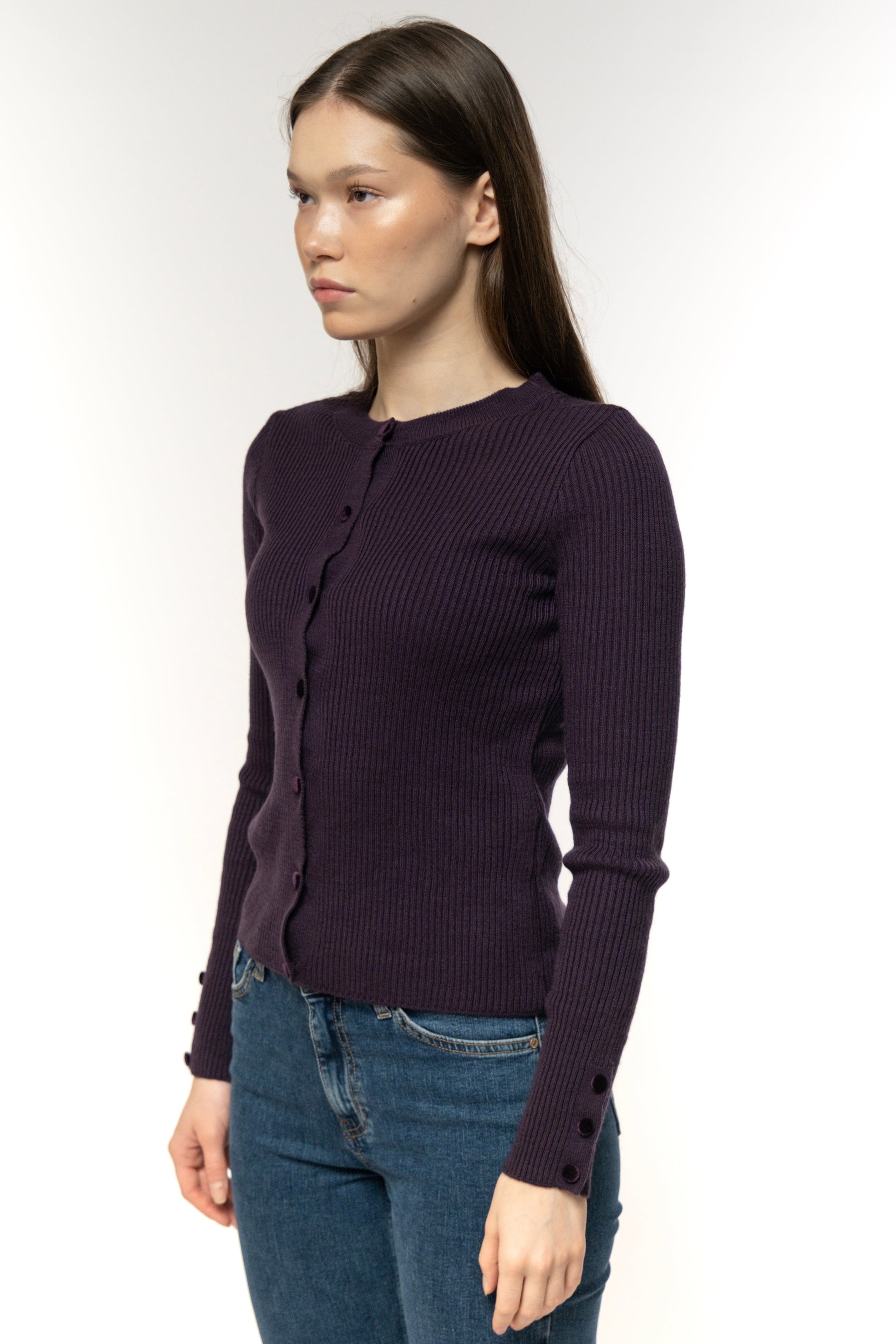 This Violet Ribbed Cardigan offers a perfect blend of comfort and style. Made from a soft, stretchy knit, it features a flattering ribbed texture that hugs the body. The button-down design and subtle puffed sleeves give this piece a classic, yet feminine touch. With a rich violet color, this cardigan can be paired easily with jeans or skirts for a chic, effortless look. Ideal for layering, it adds warmth and style to any casual outfit.