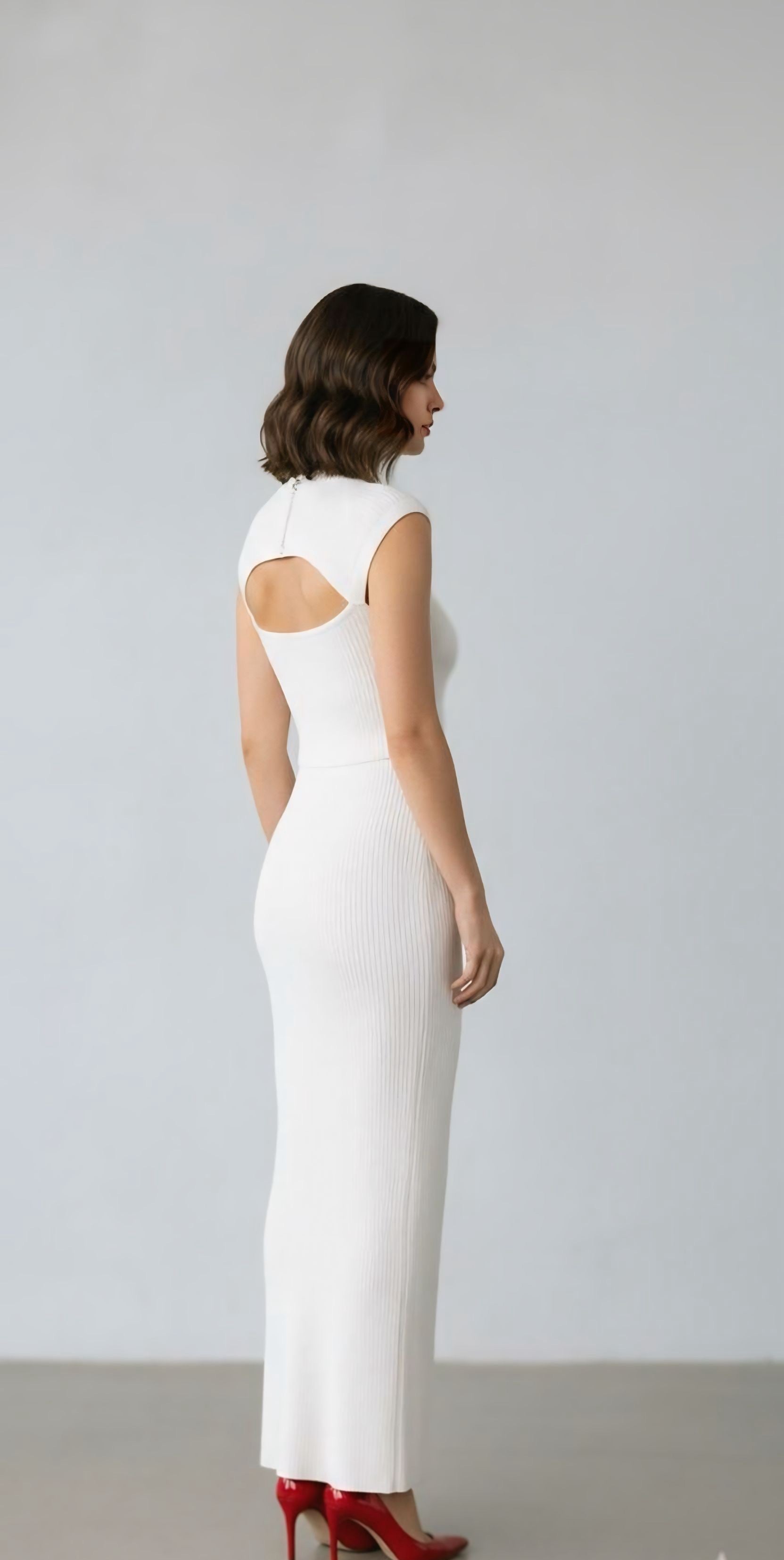 Elegant full-length knit dress in crisp white, designed with a sculpting silhouette and a modern front cutout at the neckline. Crafted from soft stretch knit that follows the body’s shape while providing comfort and structure. A minimalist yet statement piece that transitions effortlessly from day to evening.